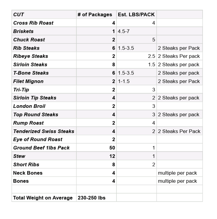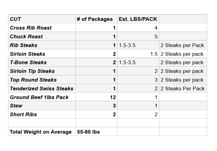 This is a side of beef that contains all cuts. When ordered ahead of slaughter it can be fully customized. Will need a full freezer to store.